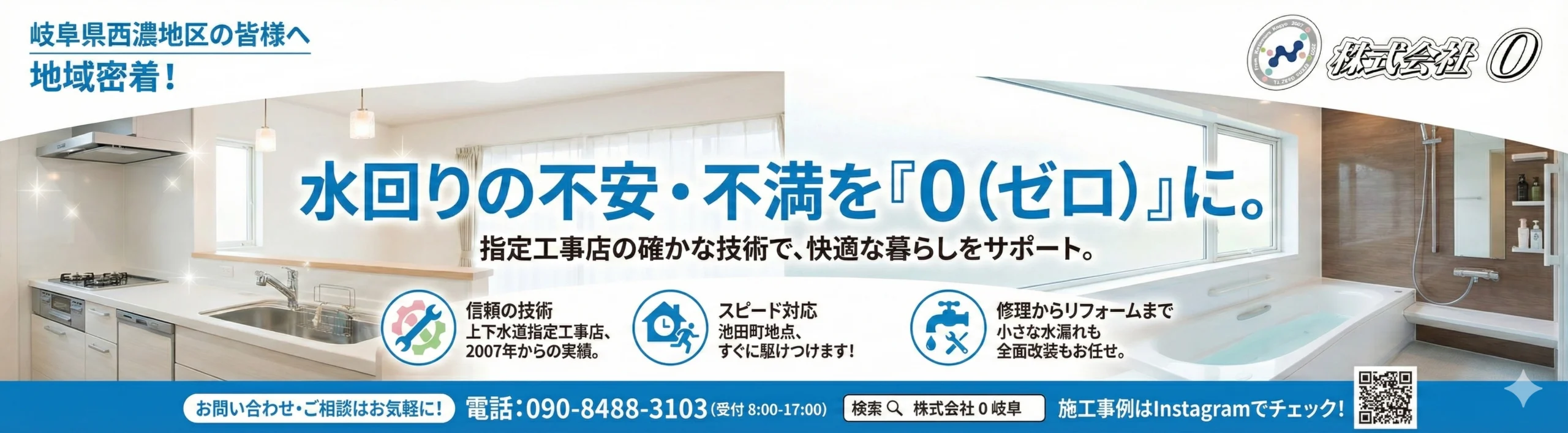 私たち【株式会社 0】は、岐阜県揖斐郡池田町を拠点に西濃地区で上下水道指定工事店として設計施工業務を行っております。豊富な知識と経験を活かし、お客様の理想に寄り添い満足していただけるよう迅速丁寧な施工を実現いたします。